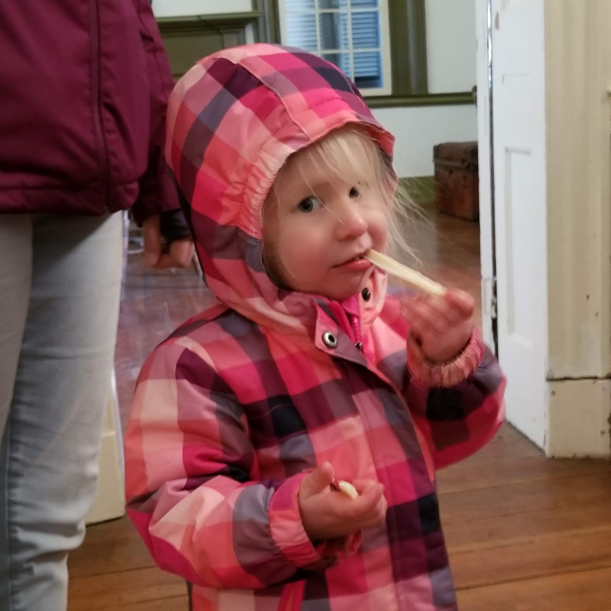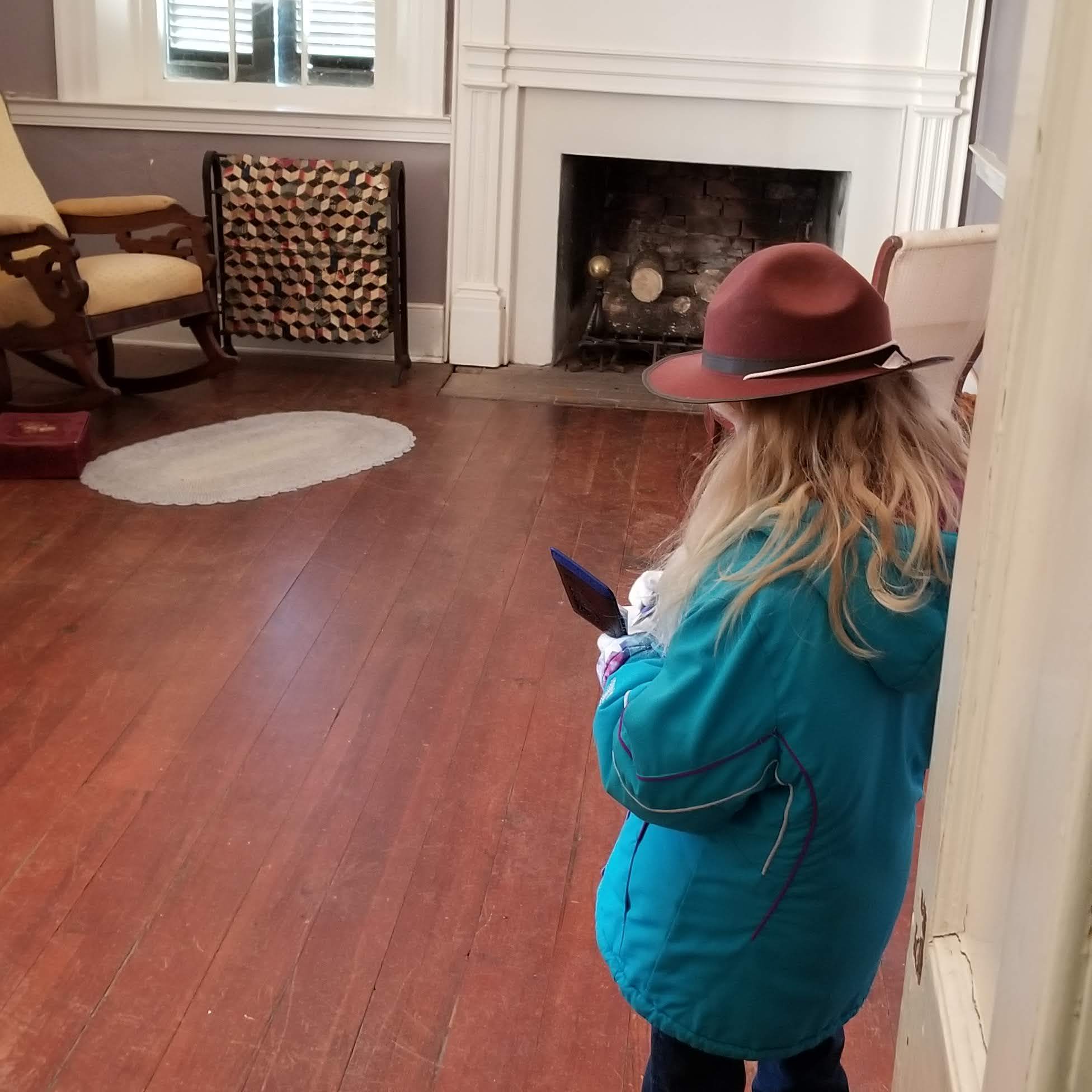 Inside the house, there were a few original pieces that interested me, such as the family Bible and songbook, and the woodworking on the stairs was very nice. Teagan also had a great time drawing what she saw inside and out.