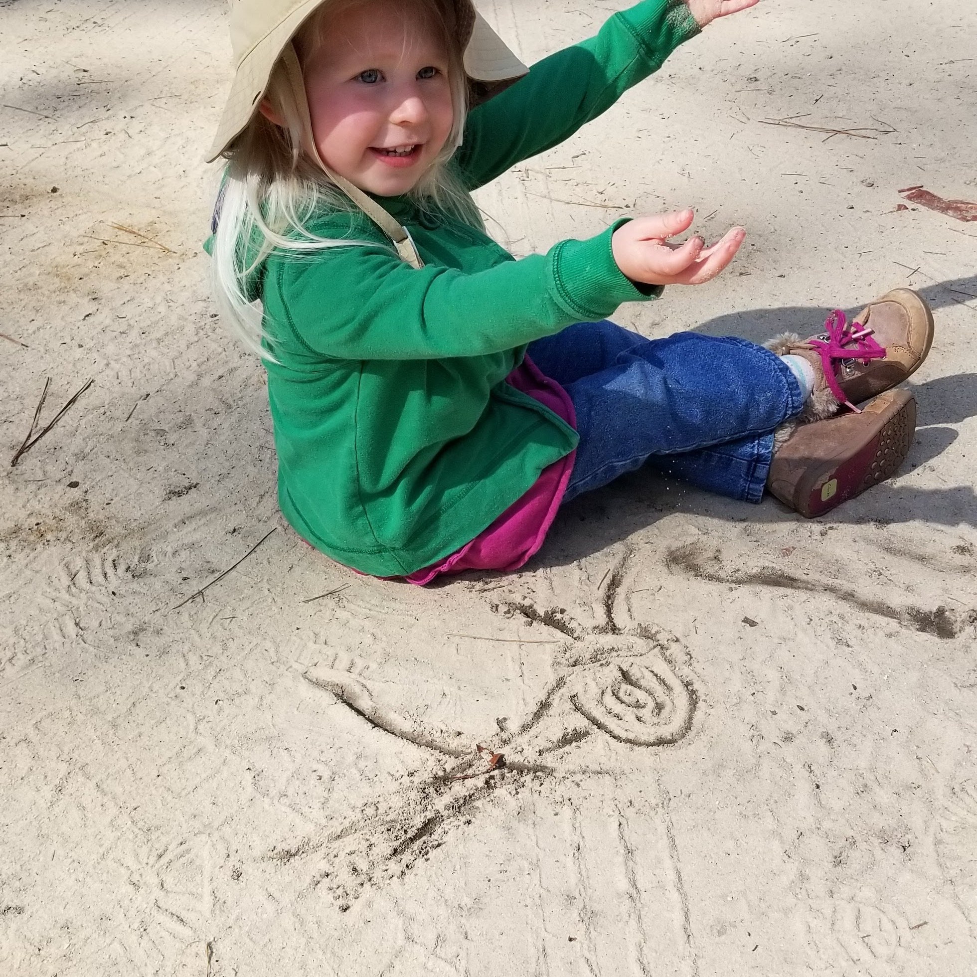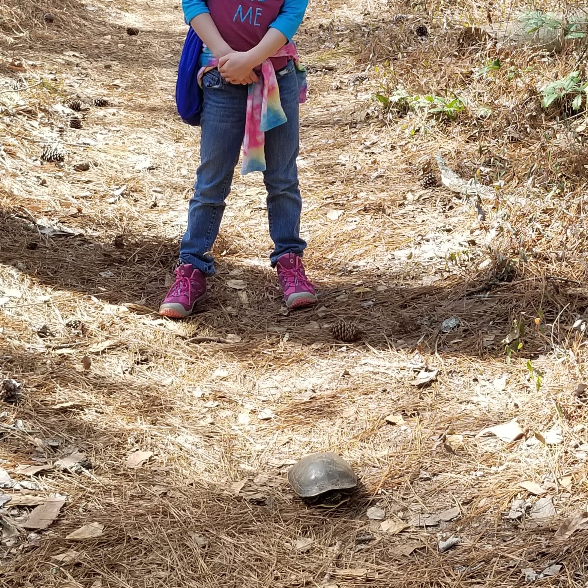 Once we finally parked, we had a short amount of time to explore the Beaver Pond Nature Trail, which is an easy 1-point-something-mile trail through the pines. It ends up at the wetlands at the upper end of the lake that is in the park. While we didn’t see any beavers, we did see plenty of wildlife, including a turtle and two snakes slithering around on this warm February day. Teagan, our very own Junior Ranger, also noticed the chattering of bats in a bat house near the park office. (Sage, a nascent Junior Ranger, enjoyed drawing a ladybug in the sand…see the picture below.)
