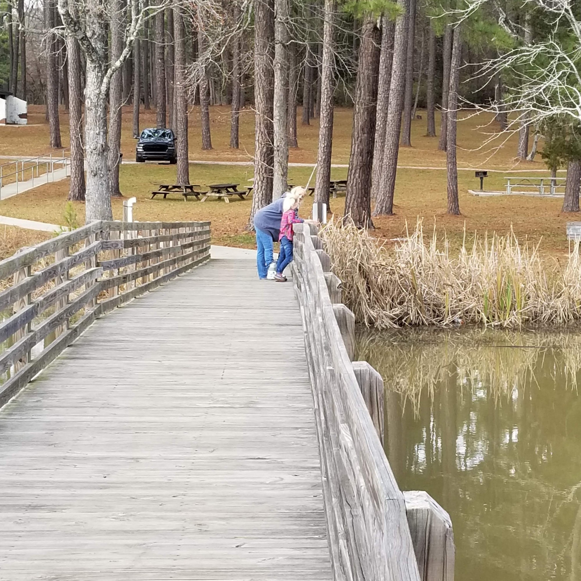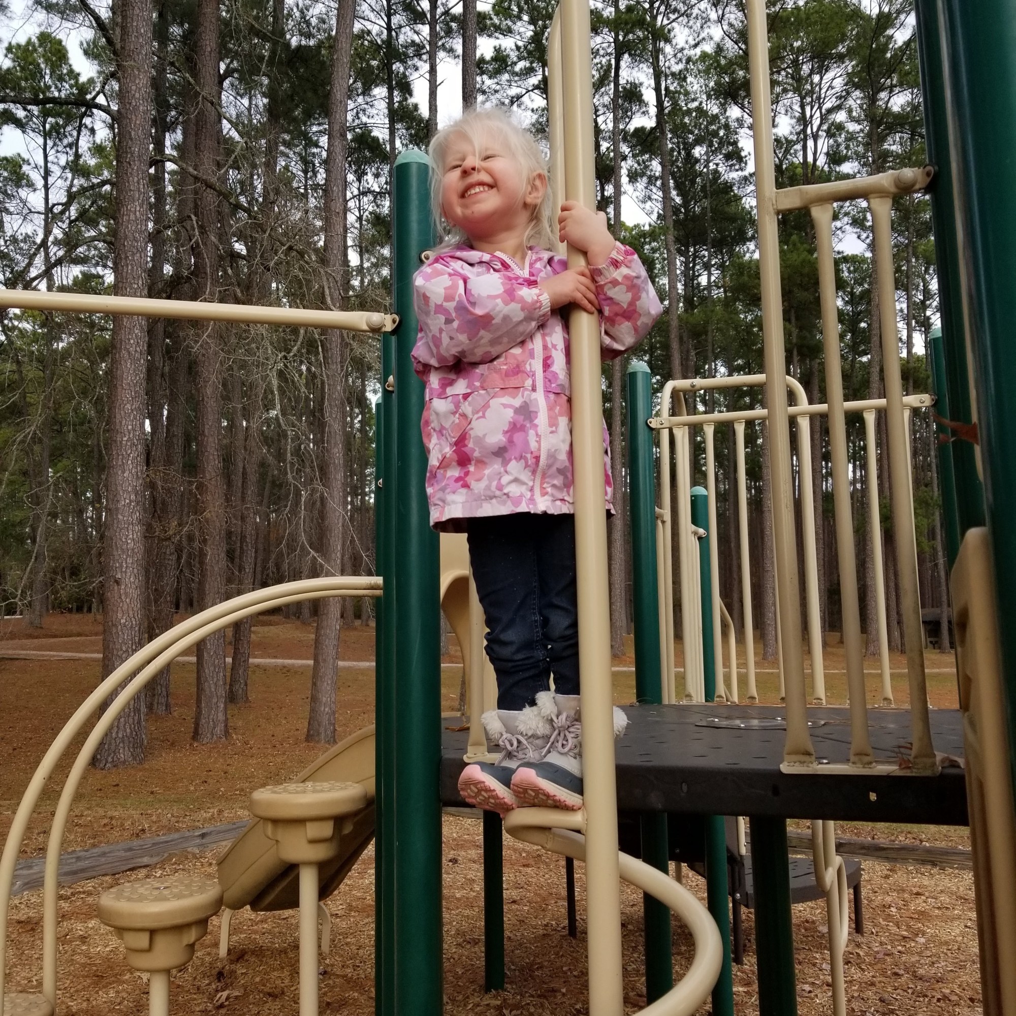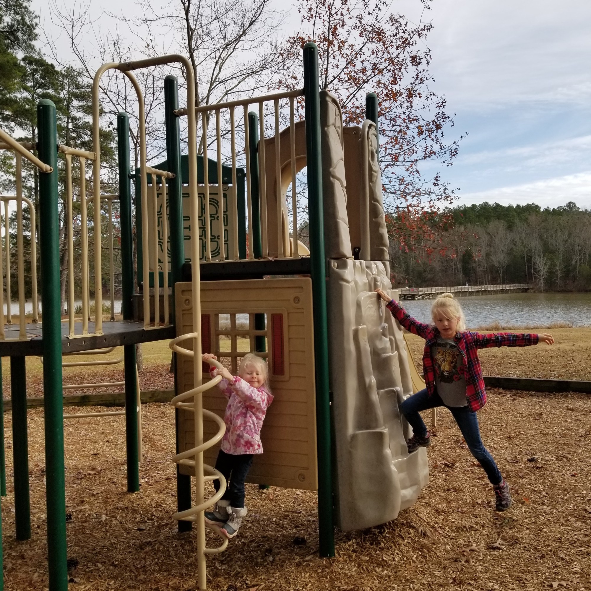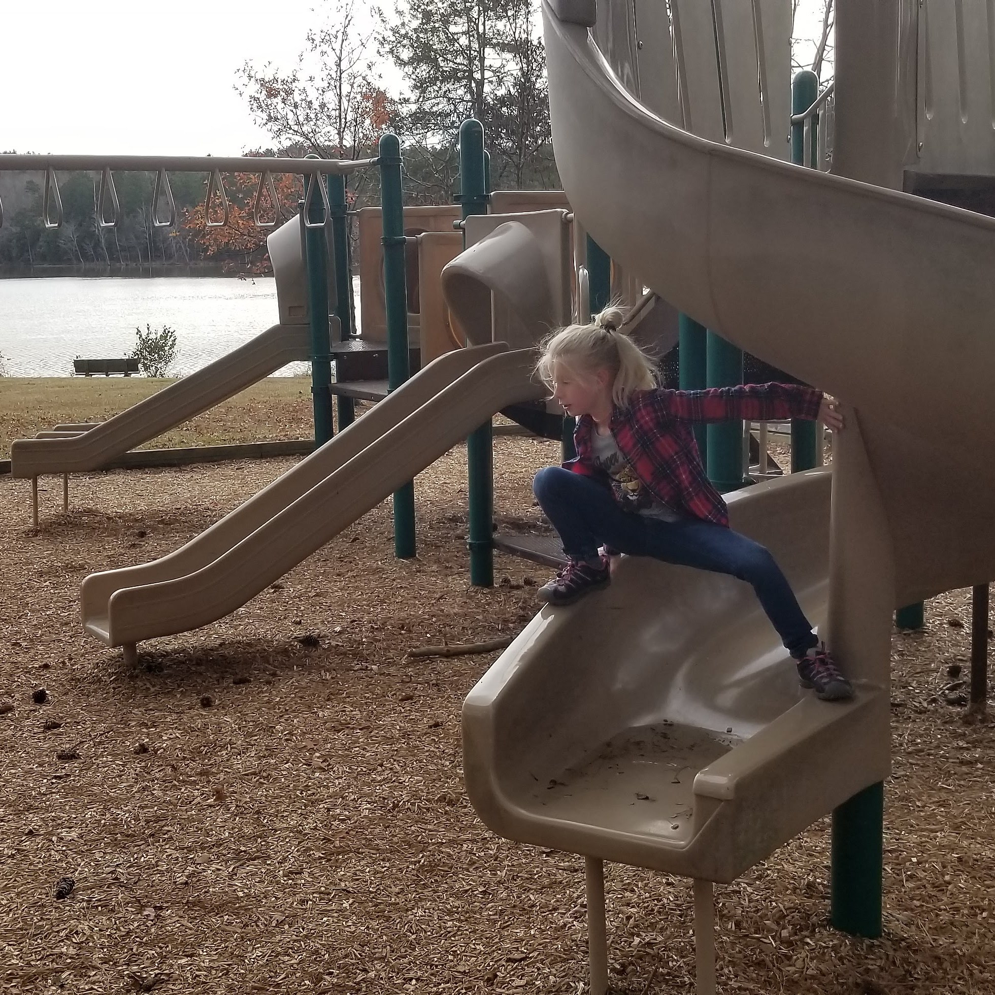 When we got there, the girls first took advantage of the playgrounds there. In the meanwhile, I was observing a lot of bluebirds fluttering about in the pine trees.