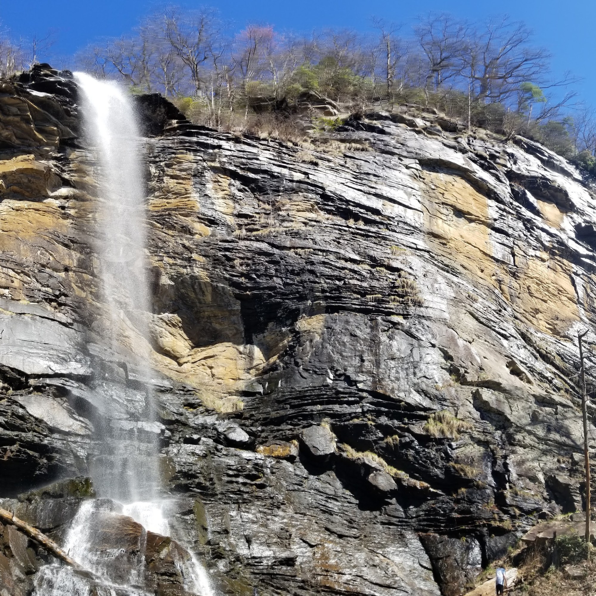 The waterfall itself is about a 100-foot free-falling cascade from an overhang. The falls looks different than other falls I’ve seen in South Carolina, as most other falls are not free-falling and instead have the water sliding down a slanted rock face. These falls also have a huge rock face behind it and on either side, giving it a great backdrop.
