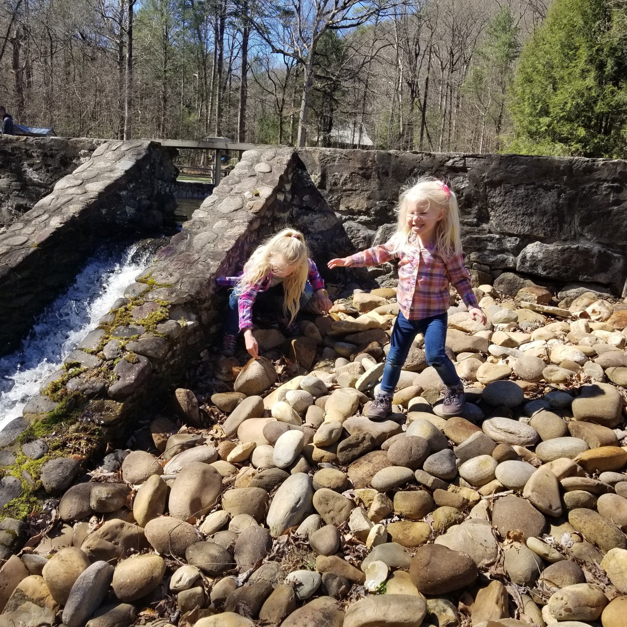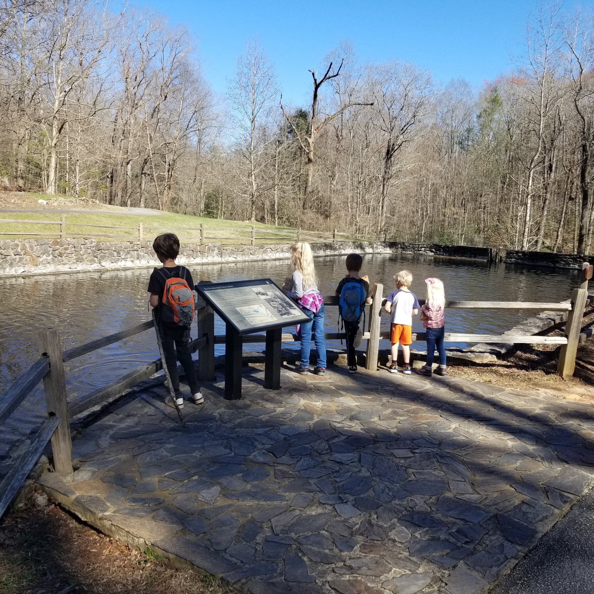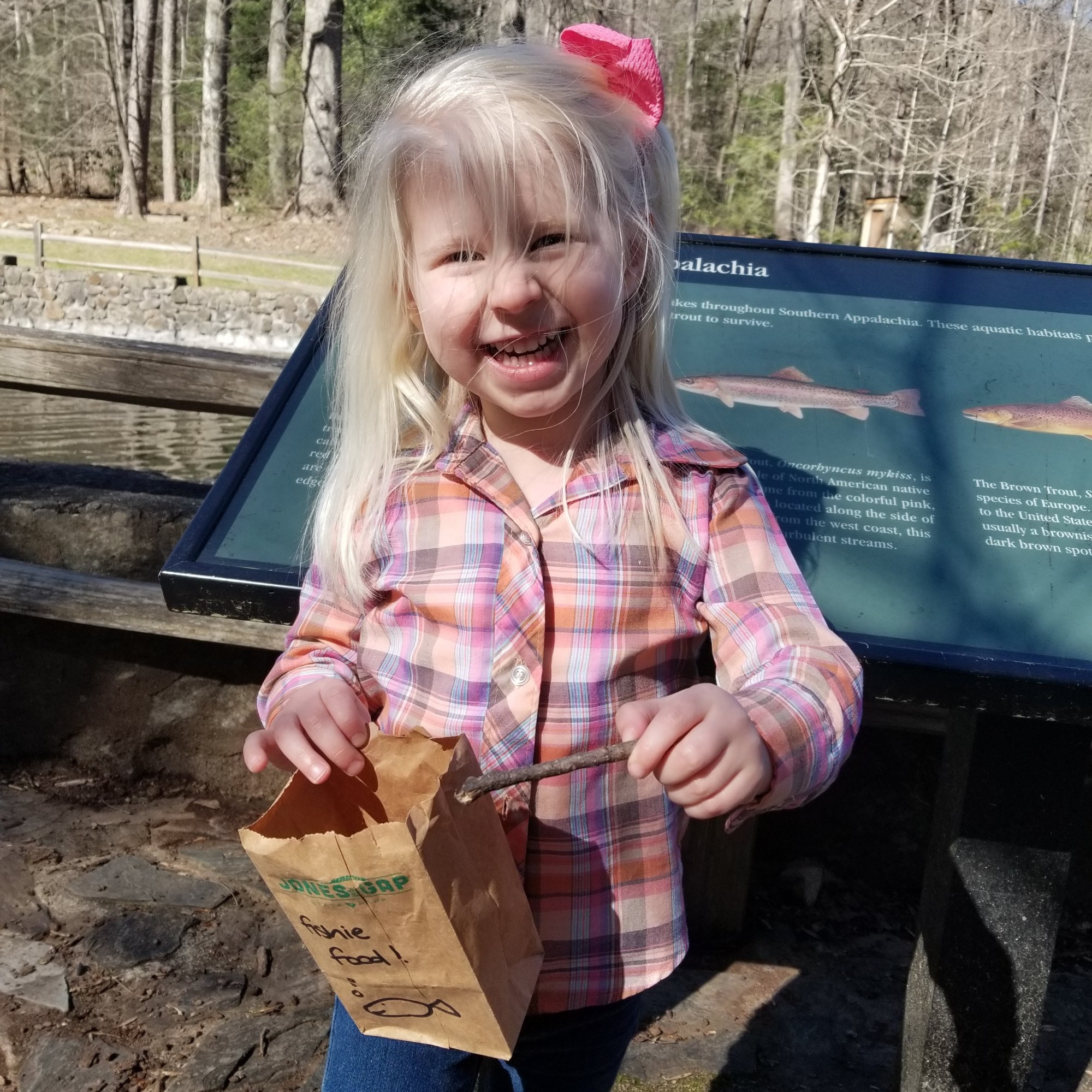 Fun fact: Jones Gap originally was home to the Cleveland State Fish Hatchery, SC’s first public fish hatchery. There still are remnants of some of the old ponds. One of the ponds still gets stocked with trout, and the kids had fun giving them something to eat.