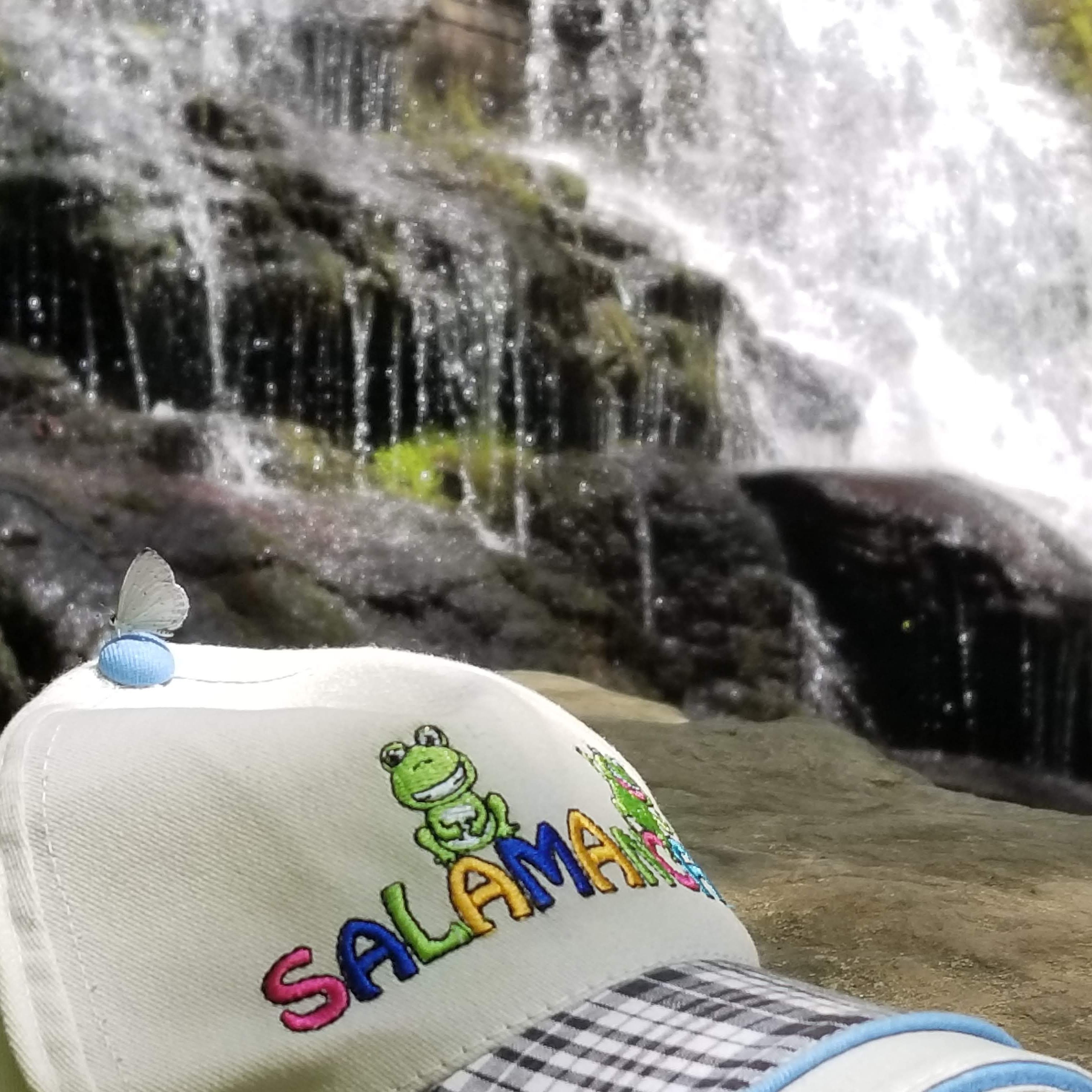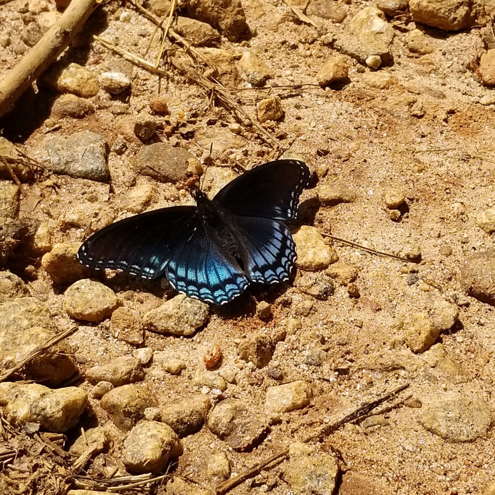 We first stopped at the Station Cove trailhead parking area. Bunny decided to stay in the car while us four Beavers set off down the trail. From the trailhead, it’s a 3/4-mile hike to the falls. You follow a stream at times, so it’s mostly flat with a few roots to look out for. We saw so many butterflies, including SC’s state butterfly, the eastern tiger swallowtail, which is yellow with some black. I didn’t get a great picture of it, but I did get a picture of the red-spotted purple, which, you know, is black and blue, because obvious.