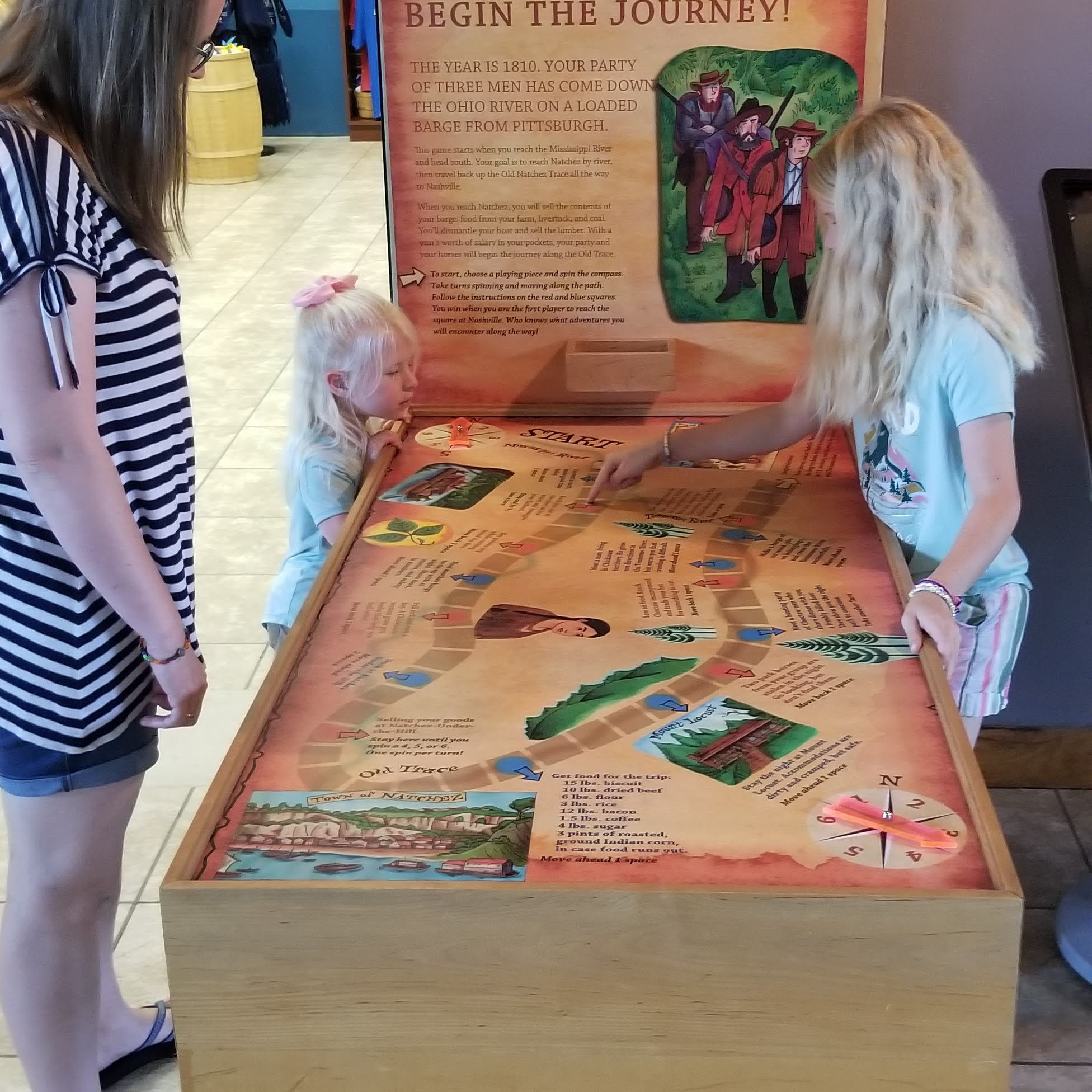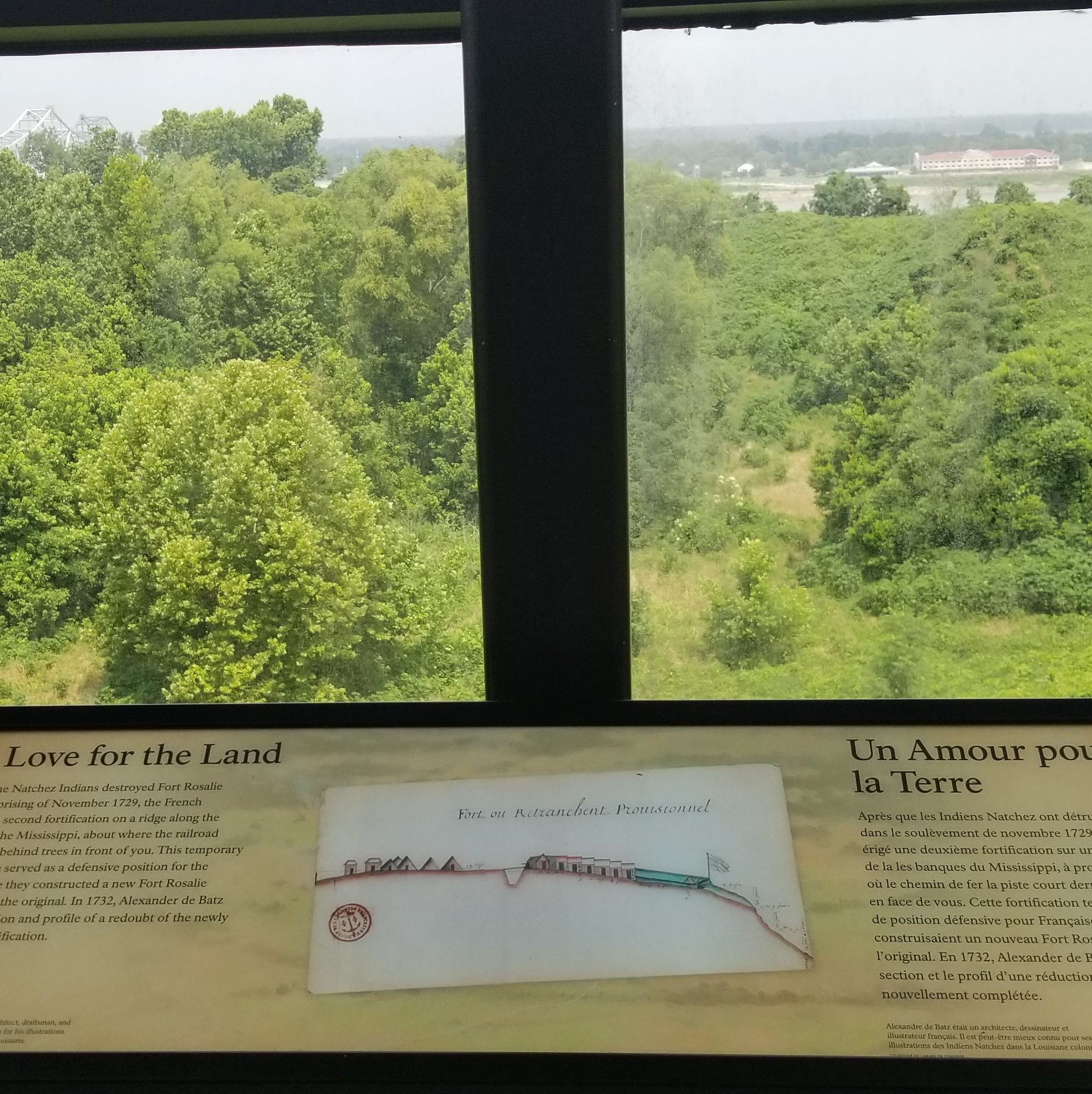 We arrived at the visitors center, located near the Mississippi River bridge. Here, we got our passport stamps, and the girls got their Junior Ranger badges. There were exhibits here talking about the city’s history. Interestingly, some of the signs were in both English and French. I don’t think the A/C was working, which was quite unfortunate on this muggy day.