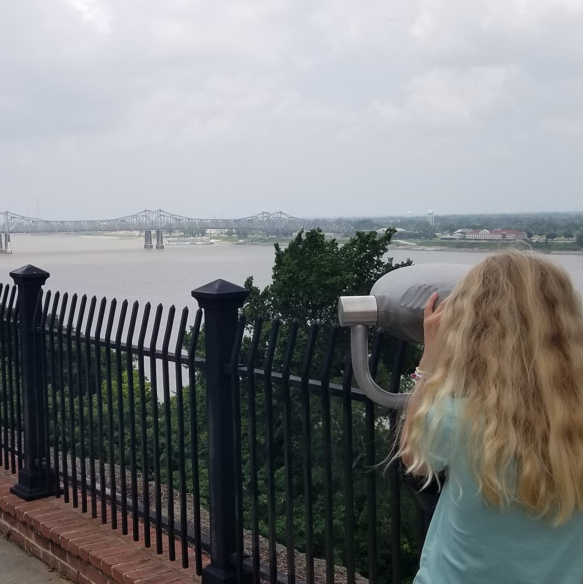 We turned around and headed towards a park on the bluff overlooking the river. Here, we enjoyed a nice picnic lunch while looking at the river. Down below, we saw a casino on a replica steamboat. Teagan in particular enjoyed the binoculars provided that didn’t require a quarter to operate.