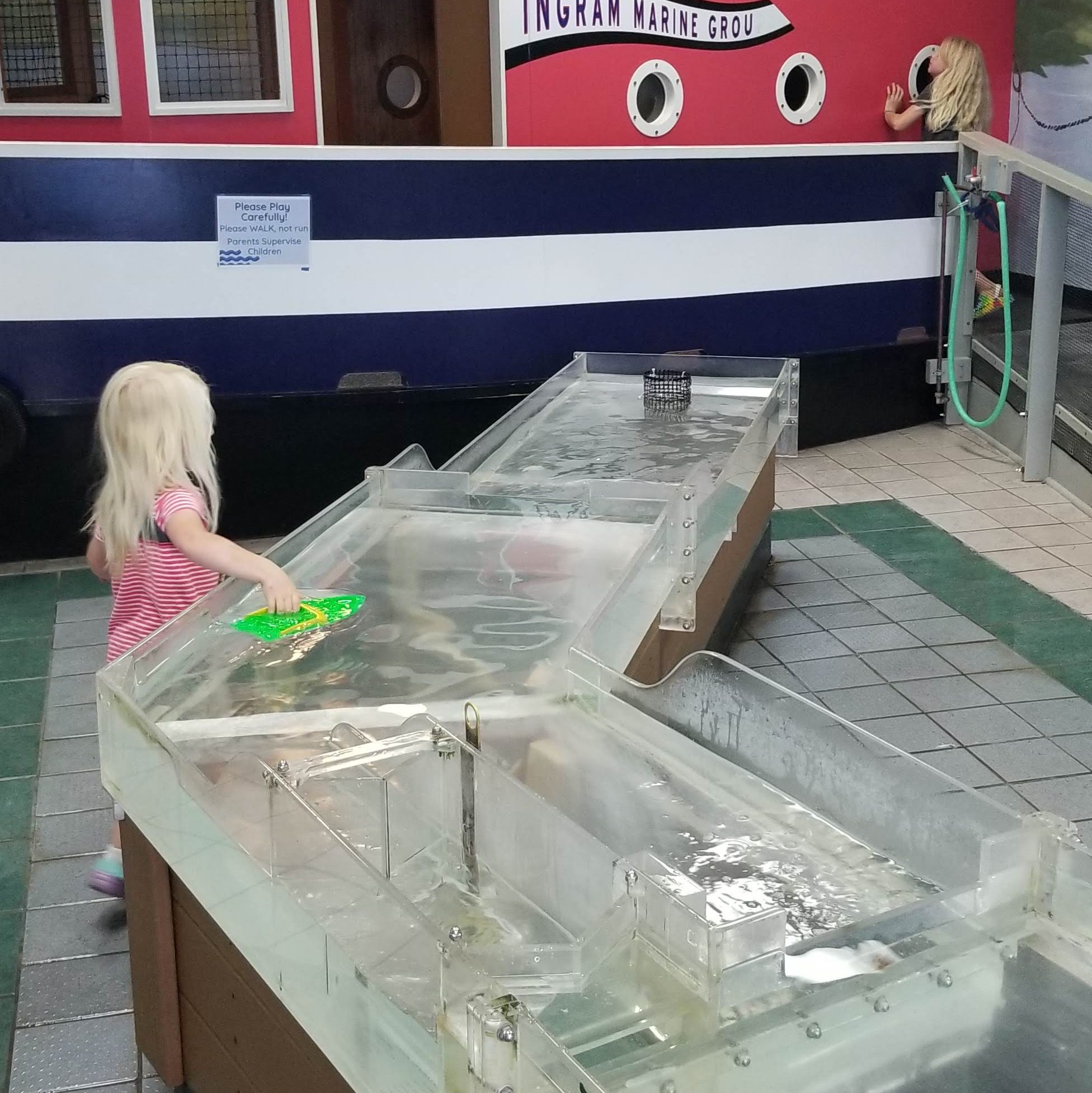 The exhibits throughout the children’s museum sometimes overlapped with the Manhattan Project history, having kids pretend to be on the lookout for spies coming to steal the research. There was a life-size dollhouse that the girls enjoyed playing with, which was coupled with a display of popular toys throughout the decades. There was also a room that allows kids to explore how locks and dams work, pertinent considering the TVA’s presence in the area.