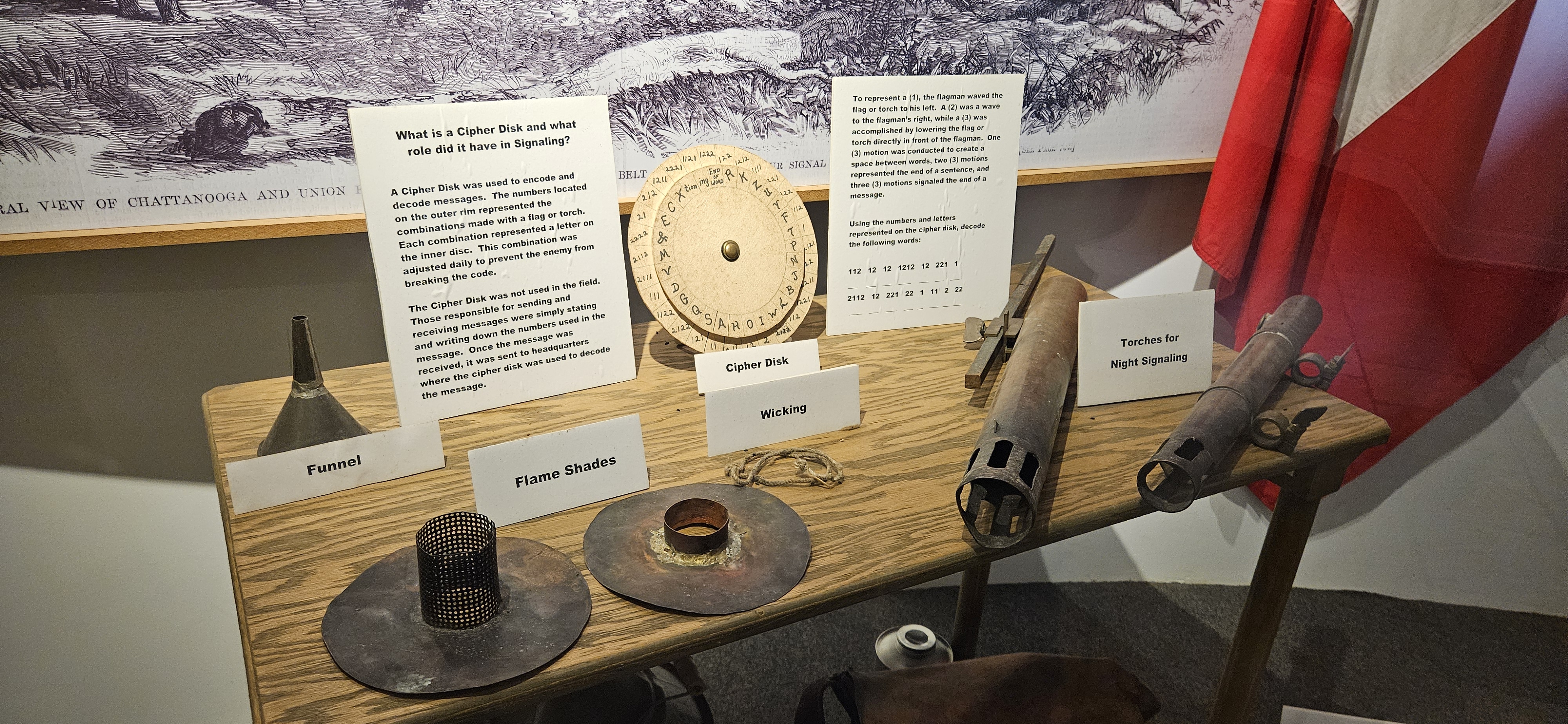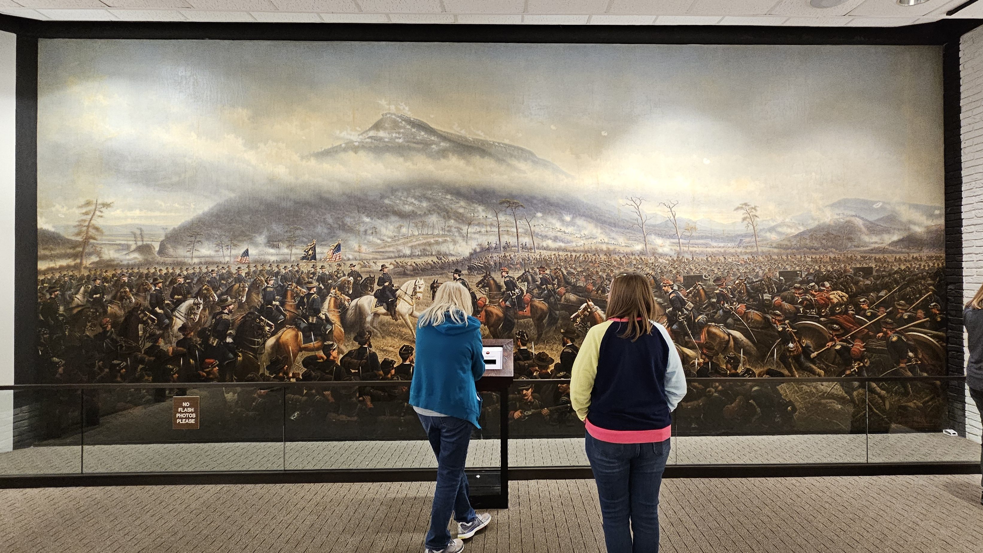 As we entered Tennessee, Lookout Mountain began to tower over us. The summit of that mountain was our next stop, which is where one unit of the Chattanooga section of the military park is located. Once we made it up, we saw an impressive painting of the Battle of Lookout Mountain, painted by James Walker in 1874, which is 13′ x 30′. The Union General Joseph Hooker (the focal point of the painting) apparently commissioned the work and paid Walker $20,000 for it (source).