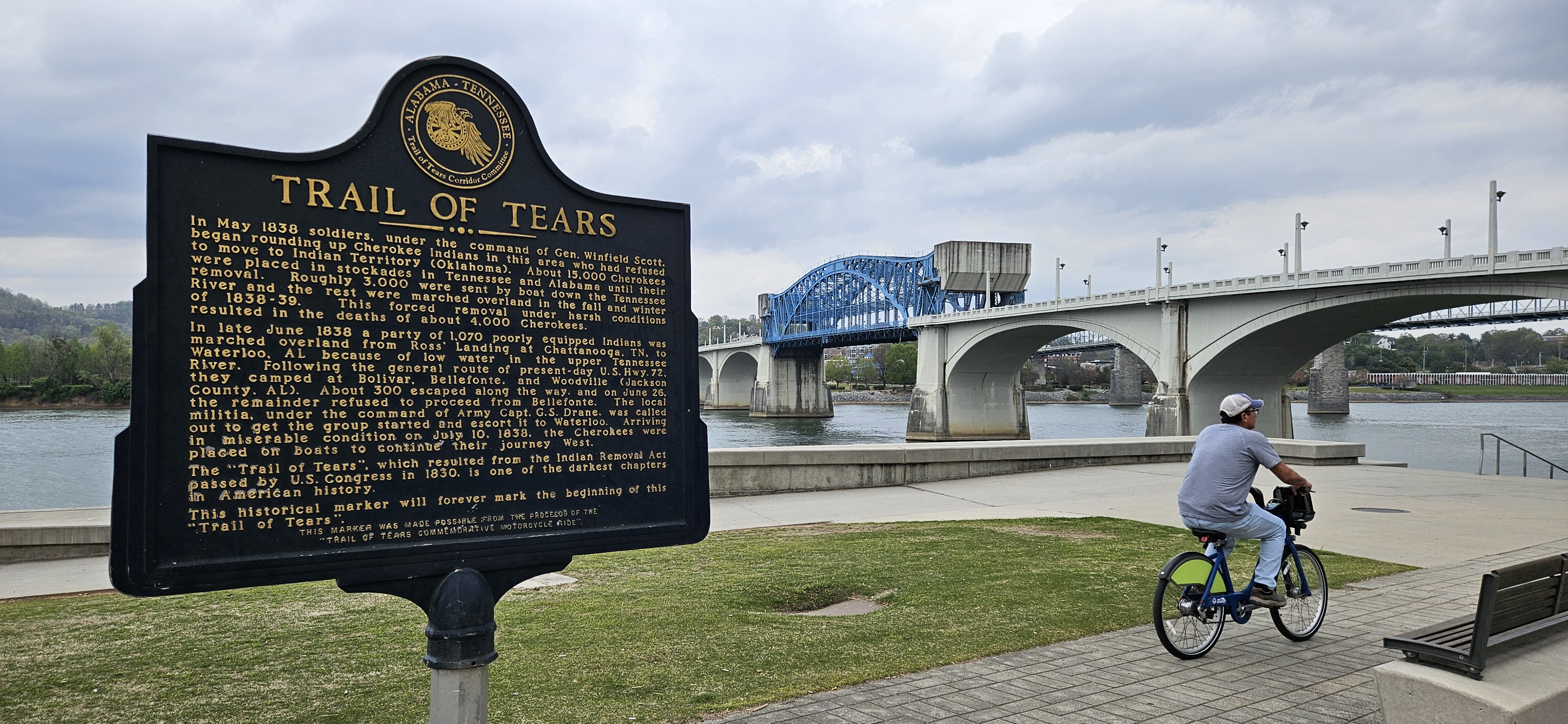 The Ross family ferry operated from what we call Ross Landing today. Before removal, it helped ferry people from Cherokee country (on the south side of the river) to the United States (on the north side). But in 1838, this was where the Cherokee, having walked the Trail of Tears, perhaps from Chickamauga where we were earlier that day, boarded a boat to head west to modern-day Oklahoma.