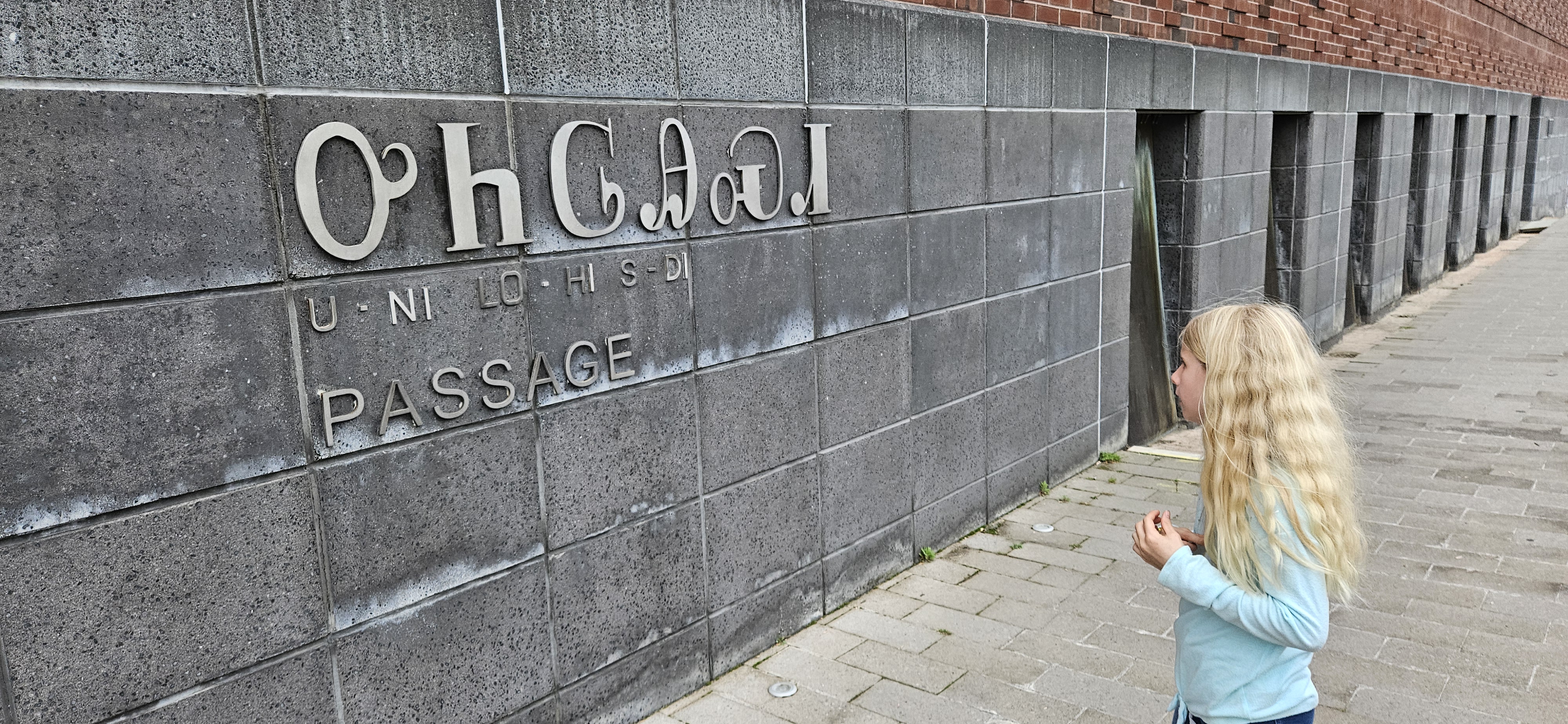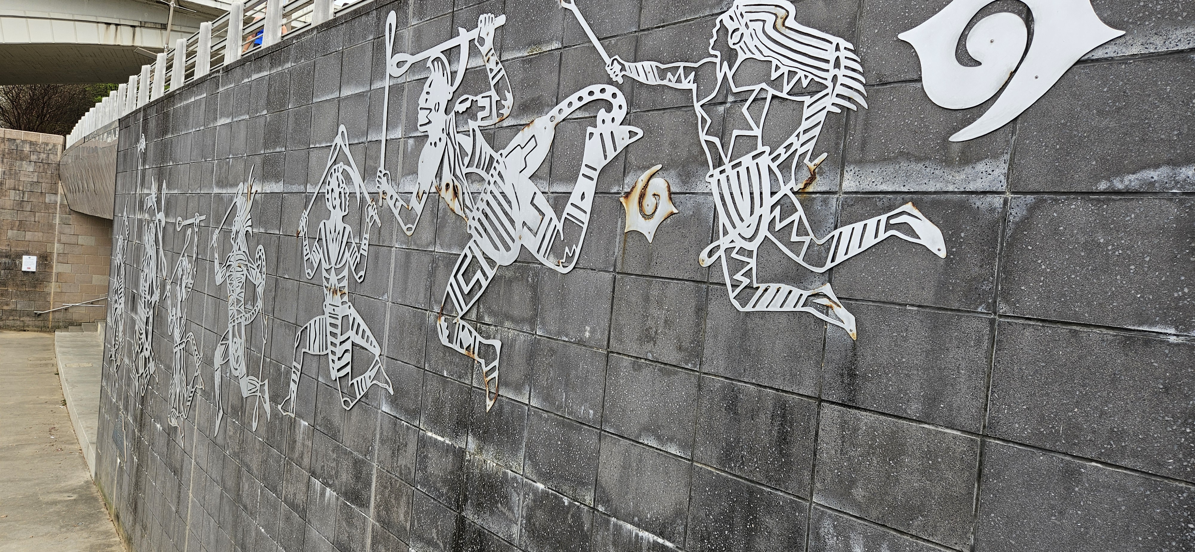 Today at Ross’s Landing, there are some signs, some Cherokee artwork with information about it, and a water feature (that perhaps only runs in the summer–it was not running when we were there). As a linguist, I especially enjoyed seeing the Cherokee script along with its transcription and translation in some of the information.