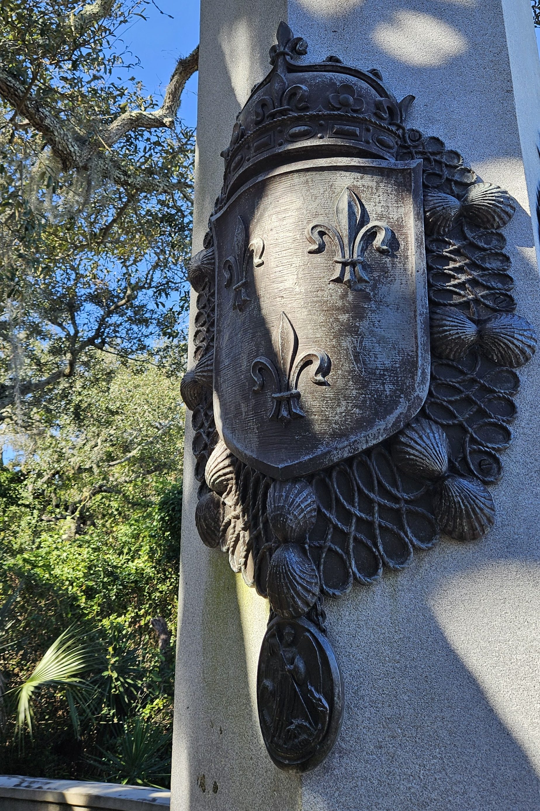 Ribault is memorialized now in many place names, including a nearby school, neighborhoods, clubs, and the ferry we used earlier in the day. Today, there is a column erected on the top of a bluff, mimicking the pillar that Ribault erected in the area back in 1562 when he was claiming the area for France. (It is the second pillar I’ve seen in honor of him, the first being back at the Santa Elena site, where the French had established Charlesfort prior to Spanish arrival.)