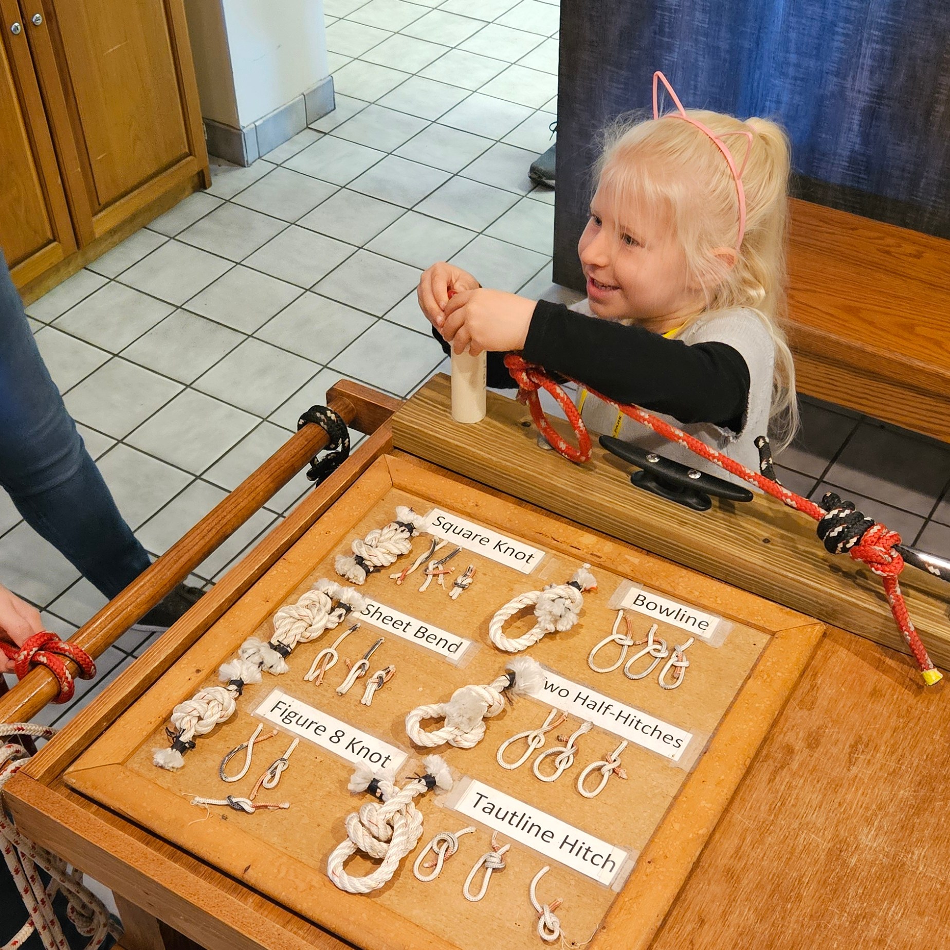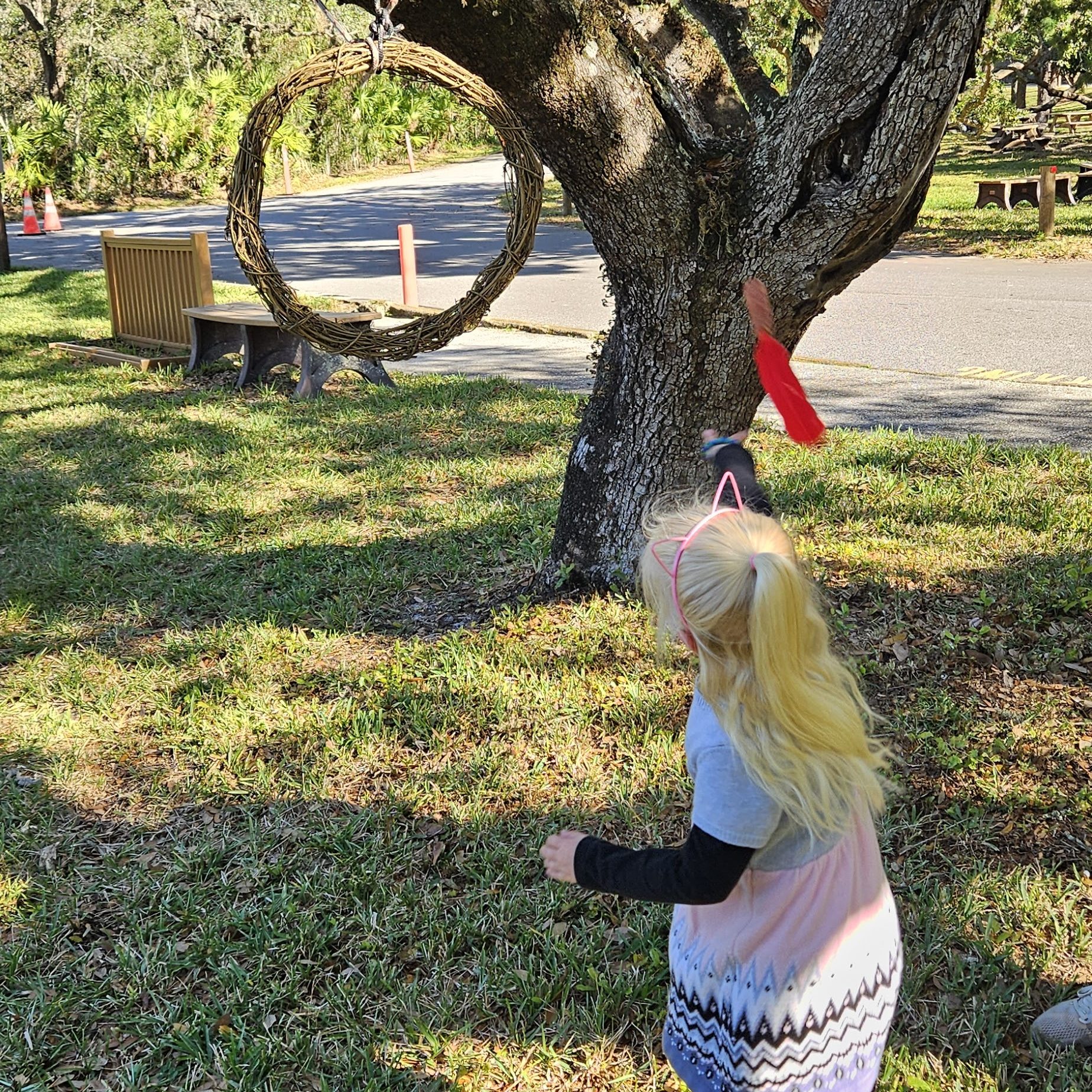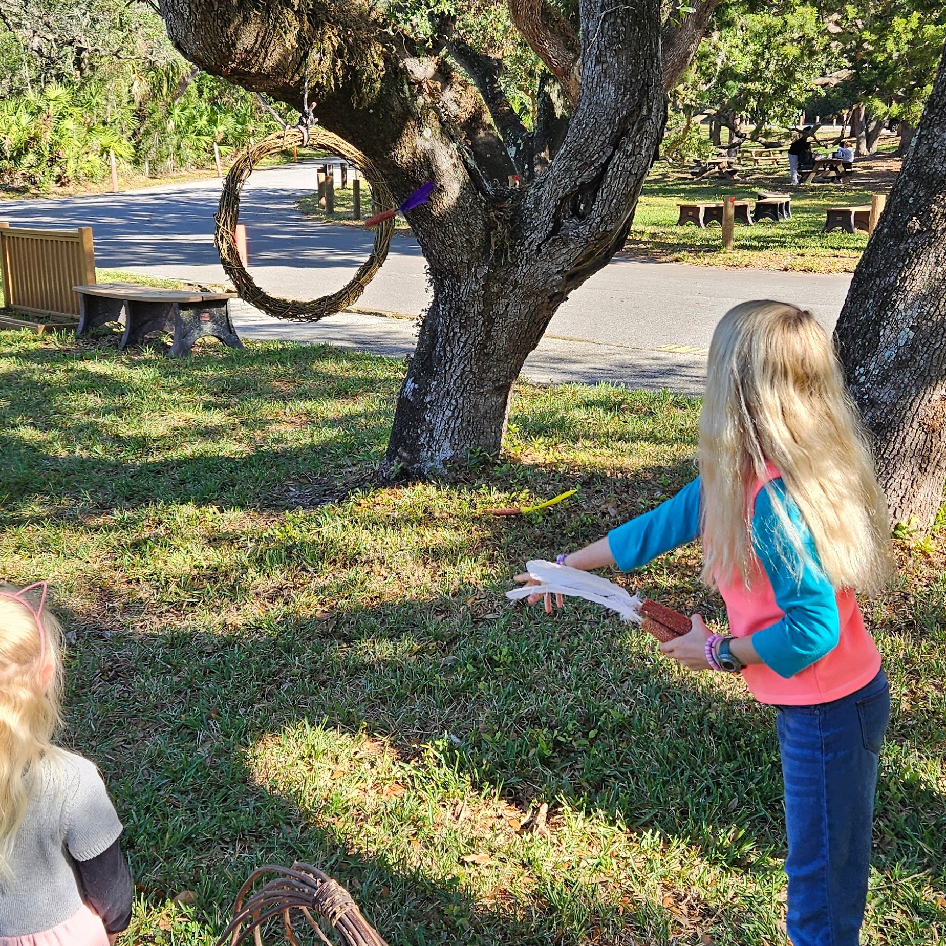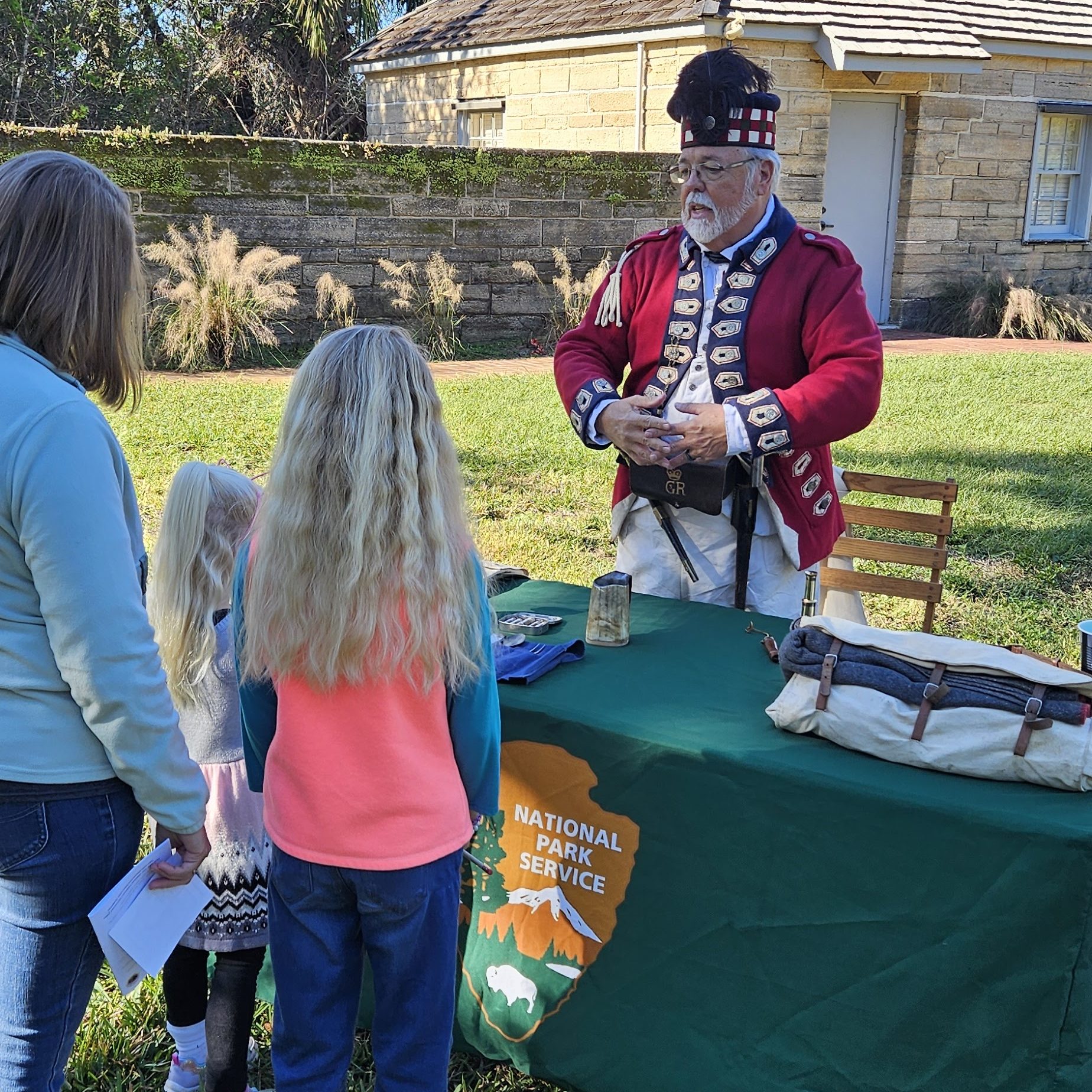 We spent our time around the visitors center, where they were having a Junior Ranger Day. They had someone spinning wool fibers into thread, someone dressed as a British soldier, someone telling about the importance of flags, and another illustrating a type of game that the Timucua people might have played to help their throwing arm. The girls practiced it, throwing a dried corn cob with a feather attached through a hoop.